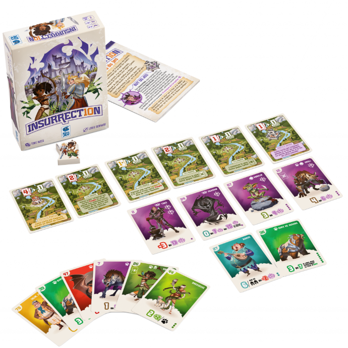 In Insurrection, you play the role of a Rebel chief willing to dismiss the tyrannical Queen Kristin. On the road to Kristin’s fortress, you’ll be recruiting troops to build the best possible army (best hand of cards). But the terrible Queen has spread Corruption throughout the population. If the Insurrection reaches Kristin’s dark castle, the Good side wins. However, if 10 marks of Corruption are simultaneously found among the people currently on the table, the Evil side wins.